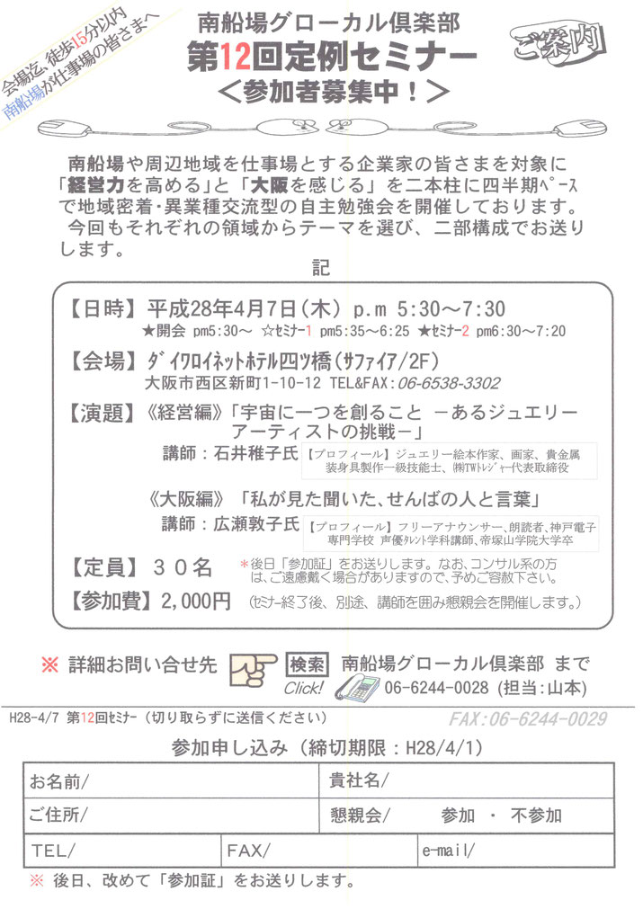 ● 第12回定例セミナーを平成28年4月7日(木)に開催しました。以下に詳細と開催の様子をご案内させていただきますので、ご笑覧ください。