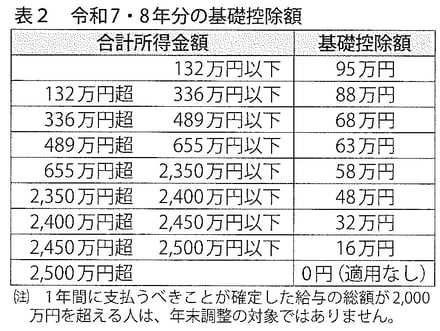 基礎控除は従来、合計所得金額が2400万円以下の場合は一律で48万円で、2400万円超2500万円以下の場合は段階的に控除額が減少し、2500万円超の場合は適用がありませんでした。これが下表2のとおり、合計所得金額に応じて基礎控除額が改正されました。なお、非居住者は控除額が異なりますので、ご注意ください。