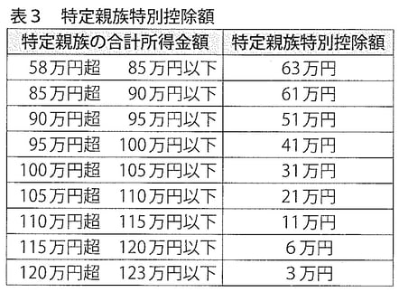 令和7年度の税制改正で、居住者が特定親族を有する場合には、その居住者の総所得金額等から、その特定親族1人につき、その特定親族の合計所得金額に応じて63万円(下表3参照)を控除する特定親族特別控除が創設されました。