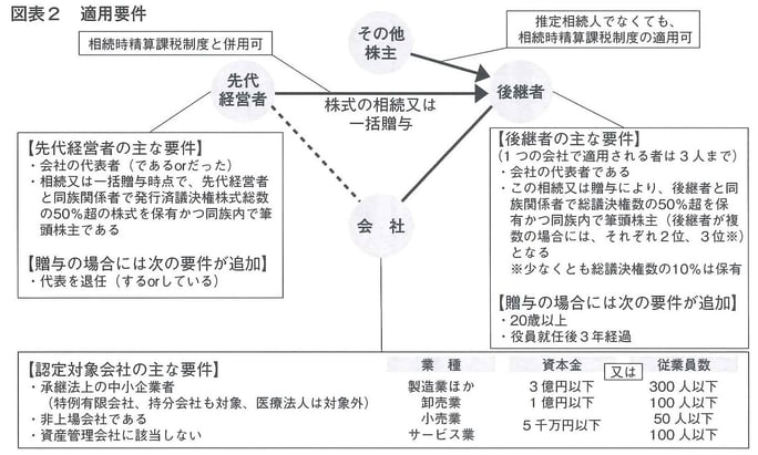 特例を適用するためには、先代経営者、後継者、会社に次のような要件が必要です(図表2参照)。