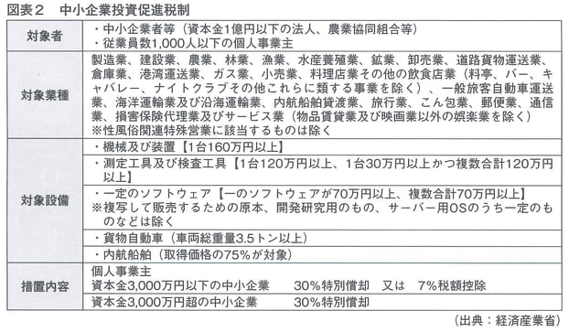 中小企業投資促進税制は、中小企業者等が一定の設備投資を行った場合に、特別償却(30%)又は税額控除(7%)が適用されるものです。ただし、税額控除は資本金3千万円以下の中小企業者等に限られています。改正では、その適用期限を令和3年3月31日まで2年延長しています。