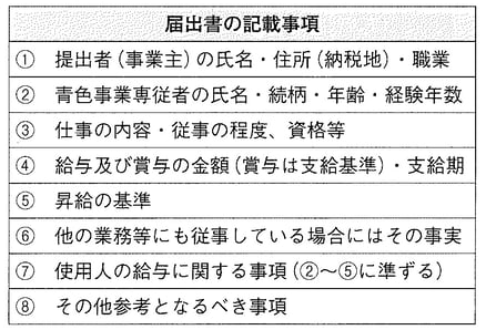 なお、この届出書には、青色事業専従者の氏名、仕事の内容、給与の金額、支給期などを記載することになっています(下記表参照)。