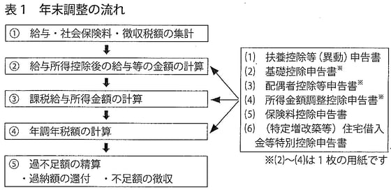 年末調整は、まず社員に対して毎月支払った給与や賞与(以下「給与等」)、社会保険料や源泉徴収税額を集計し、給与所得控除後の給与等の金額を計算します。社員から提出された各種申告書の内容をもとに、所得控除の額(表2参照)・課税給与所得金額・税額控除額を計算し、年調年税額を計算します。そして給与等を支払う際に徴収した源泉徴収税額と年調年税額とを比較して、過不足額を精算します。