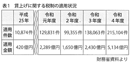 創設からこれまでの、賃上げに関する税制の適用状況を示したのが【表1】です。平成25年度の全体の適用件数は1万件余り、適用金額は420億円でしたが、令和4年度では適用件数が21万5千件、適用金額が5100億円余りに増加しています。