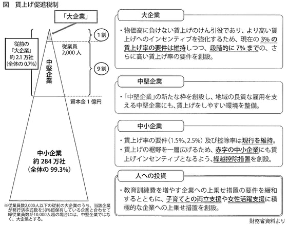 これを示したのが「図」です。賃上げのけん引役である大企業には、更に高い賃上げ実現を目指すインセンティブを与え、また地域の良質な雇用を支える中堅企業にも、より賃上げしやすい環境を整備したのです。