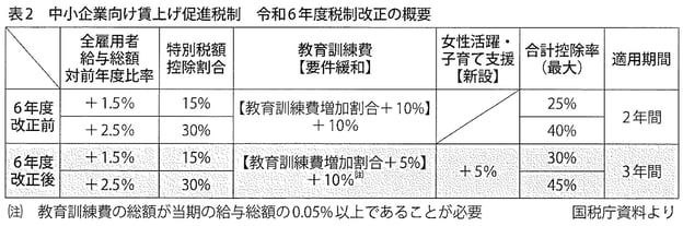 これら赤字決算の法人でもより積極的に賃上げに取り組めるよう、6年度税制改正では、中小企業向けの従来の適用要件を緩和、または新たな適用要件を設けるなどして合計控除率を拡大するとともに、その適用期限を3年延長しました。【表2】
