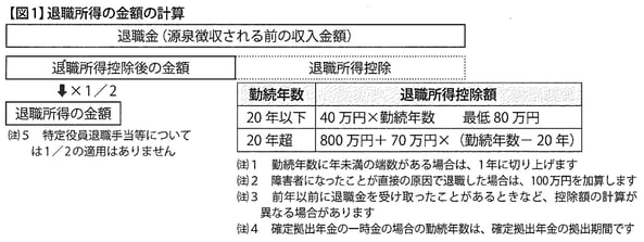 退職所得の金額は、原則として収入金額から退職所得控除額を差し引いた金額に2分の1乗じて計算します。税額は、原則として他の所得と分離して所得税額を控除します。【図1参照】