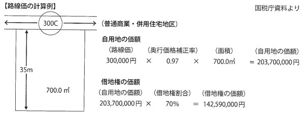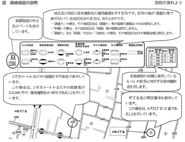 路線価とは、路線(道路)に面する標準的な宅地の1㎡当たりの価額(千円単位で表示)を表しています。その年の1月1日から12月31日までの間に相続、又は贈与で土地の取得をした場合に、その年の7月1日に発表された路線価を適用します。