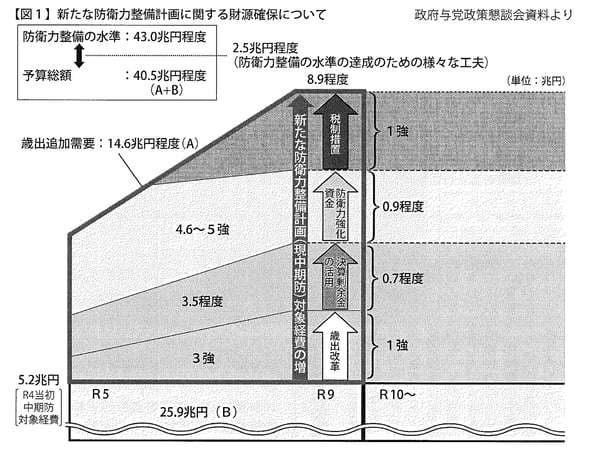 政府与党政策懇談会資料として示された「新たな防衛力整備計画に関する財源確保について」【図1】では、令和9年度時点で歳出改革により1兆円強、決算剰余金の活用により0.7兆円程度、防衛力強化資金の創設により0.9兆円程度、税制措置により1兆円強を確保する構想が示されました。