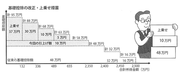 従来、基礎控除額は最高48万円でしたが、10万円引き上げられて58万円になりました。さらに低所得者層の税負担に配慮する観点から、基礎控除の上乗せを恒久的措置として行うことになりました。【下図参照】