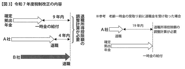 令和7年度税制改正では、課税の公平性の観点から、前記②のケースについて見直しが行われました。これにより、退職金の支払いを受ける年の前年以前9年内に老齢一時金の支払いを受けている場合には、退職所得控除額の調整計算をすることになります。【図3参照】