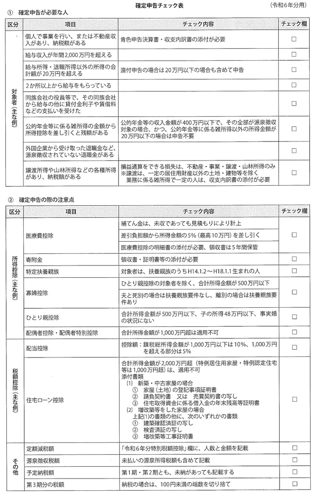 今年も確定申告の時期になりました。令和6年分の確定申告と納税の期限は、令和7年3月17日です。下表に確定申告の主な対象者や注意点をまとめたチェックリストがありますので、ご活用ください。