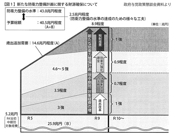 政府与党政策懇談会資料として示された「新たな防衛力整備計画に関する財源確保について」【図1】では、令和9年度時点で歳出改革により1兆円強、決算剰余金の活用により0.7兆円程度、防衛力強化資金の創設により0.9兆円程度、税制措置により1兆円強を確保する構想が示されました。